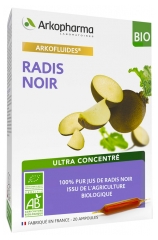 Arkofluides Radis Noir Bio 20 AmpoulesCe produit est un complément alimentaire ultra concentré à base de radis noir, réputé pour sa racine épaisse et comestible qui possède une saveur caractéristique.
