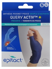 Querv'Activ Orthèse Poignet Pouce Souple d'Activité DroiteCe produit est une orthèse dont le port est préconisé lors des activités quotidiennes en cas de ténosynovite de De Quervain, de tendinite et de troubles musculo squelettiques du pouce.Elle limite les micro mouvements traumatisants et maintient le pouce en position de repos tout en conservant l'entière fonctionnalité de la main.